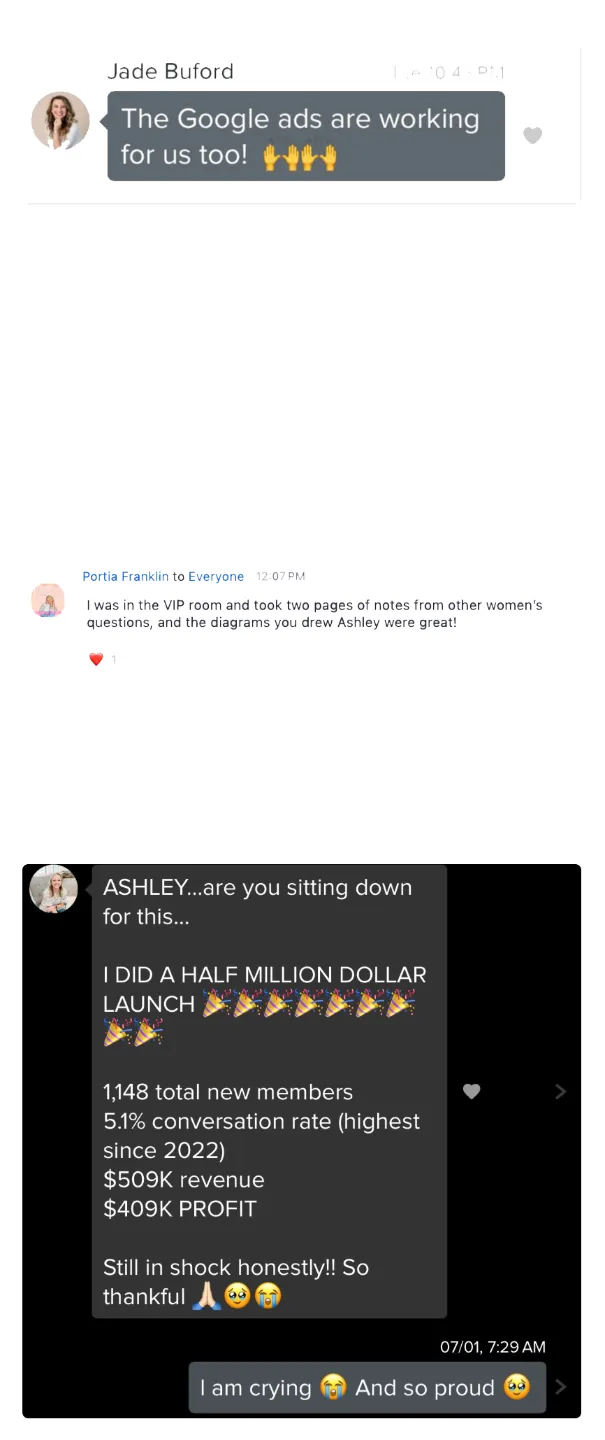 Direct Access to Ashley (in the VIP Room): Be in the room LIVE as Ashley coaches six-, seven-, and eight-figure entrepreneurs on their ad strategies. You’ll watch and learn from their breakthroughs — and take notes you can apply instantly to your own business. ($2,997 value)